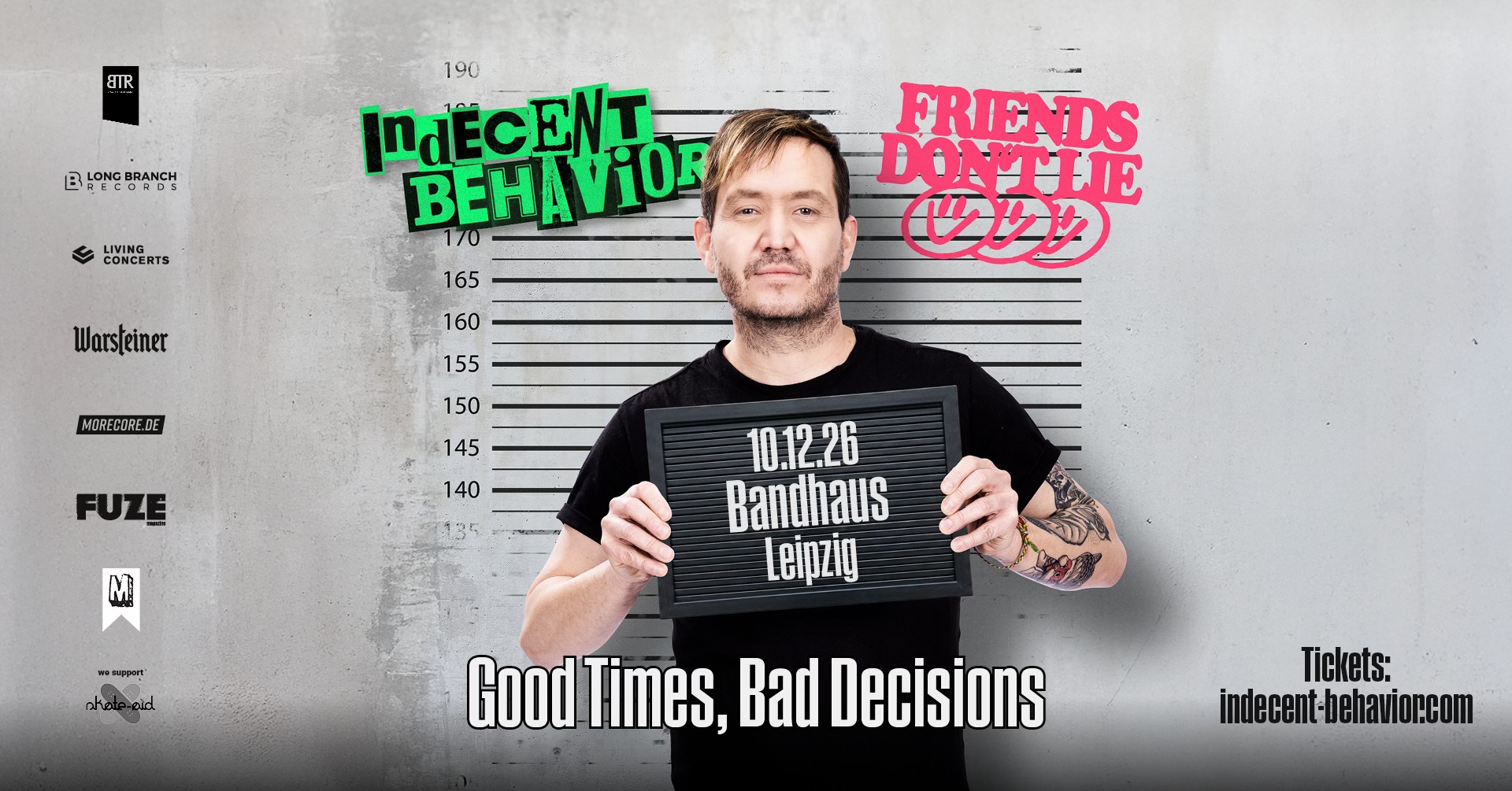 Wenn zwei der spannendsten Acts der aktuellen Punk- und Rockszene gemeinsame Sache machen, ist Abriss garantiert: Indecent Behavior und Friends Don’t Lie gehen 2026 & 2027 auf große Co-Headlinertour.