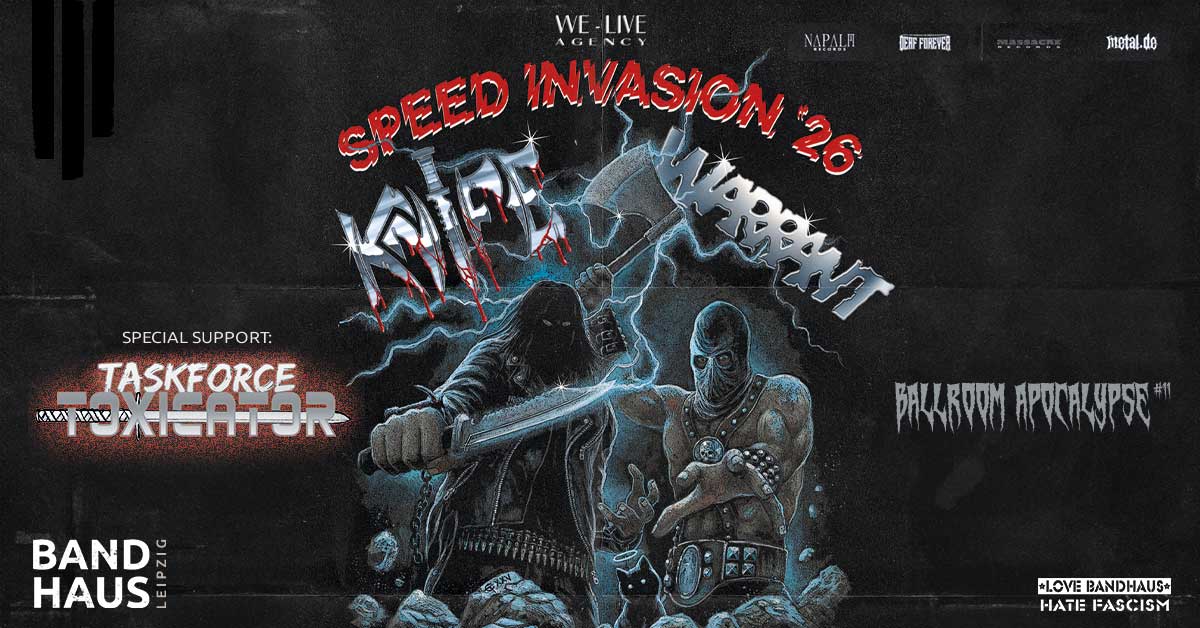 “Forged in the hot winds, tempered by the shrieking sounds of Hades, a blade made of immortal steel rose from the depths to vindicate the souls of those who obey the true sound of METAL. Ferocity, power and speed. Metal like a hammer blow! KNIFE is unleashed!” Founded in late 2019 willing to play fast and wild METAL, the German outfit KNIFE released their debut tape “Black Leather Hounds” which features the first singles “Sword Loser” and the title track in early 2020. In September 2020, the band released the second assault “Locked In”. 4 Tracks of full Metal Mayhem – in your face! By mixing all their influences from classic HARD ROCK, HEAVY METAL to First Wave BLACK METAL and PUNK, KNIFE deliver a wild and nasty METAL sound. In October 2021 the self-titled debut album “Knife” was released via Dying Victims Productions. In 2022 the band released the 3-track EP “Sounds of Sacrifice”. After signing a contract with the Austrian Metal Label Napalm Records, the second full length album “Heaven Into Dust” is released in August 2023.
